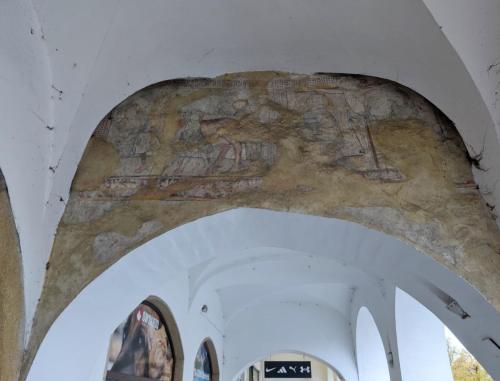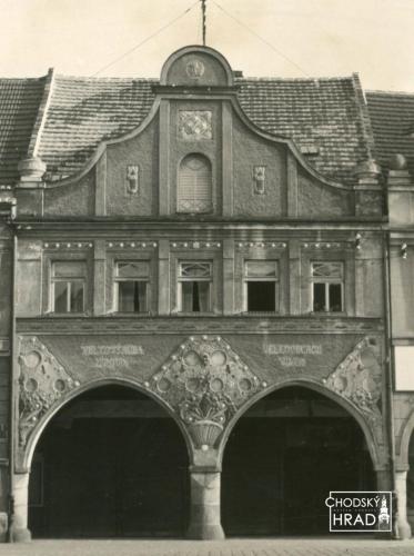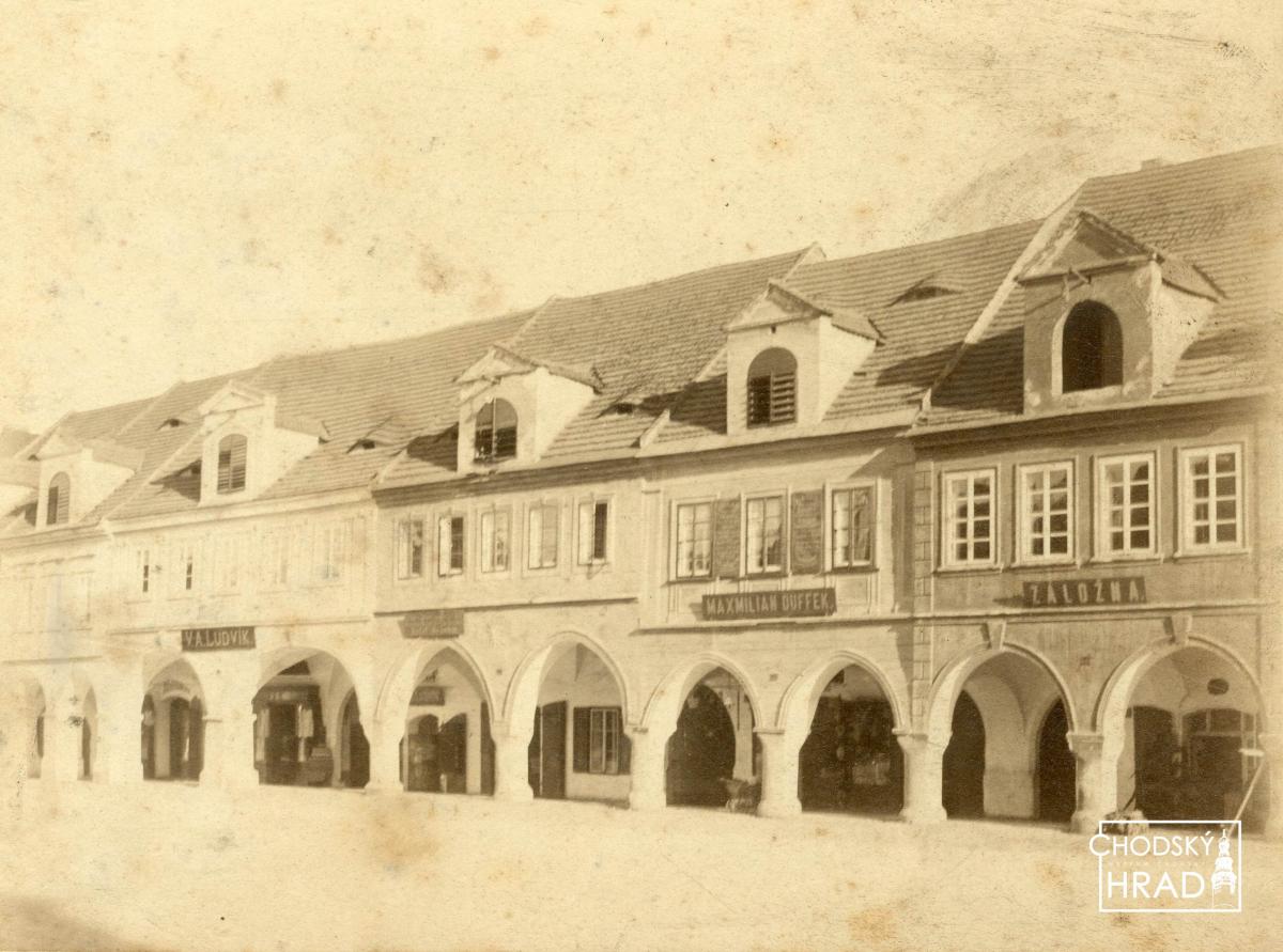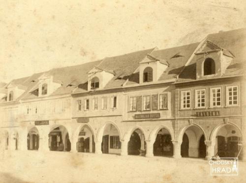 Die längliche Form des Stadtplatzes von Domažlice zeigt deutlich, dass er entlang eines Handelsweges gebaut wurde, eines Landesweges, der Prag mit Regensburg und München verband. Ursprünglich war der Marktplatz breiter, aber der Laubengang schnitt auf beiden Seiten davon ein paar Meter ab. Durch den Laubengang wurde die Fläche der oberen Hausstockwerke vergrößert, und ein Raum geschaffen, der nicht nur die Menschen, sondern auch gotische Portale (Eingänge) oder wertvolle Fresken vor der Witterung schützte. Eine Wandgemälde mit dem Thema Fleischerei aus dem Ende des 16. Jahrhunderts befindet sich am Haus Nr. 62. Die Häuser waren früher durchfahrbar, d.h. ein Wagen konnte durch das Haustor vom Marktpaltz einfahren und durch das hintere Haustor in die anliegende Strase ausfahren. Das Erdgeschoss diente den Zwecken des Handels oder des Handwerks, das Obergeschoss als Wohnraum und die Keller dienten zur Lagerung von Lebensmitteln und auch als Notunterkunft, falls das Haus einem der vielen Brände zum Opfer fiel.