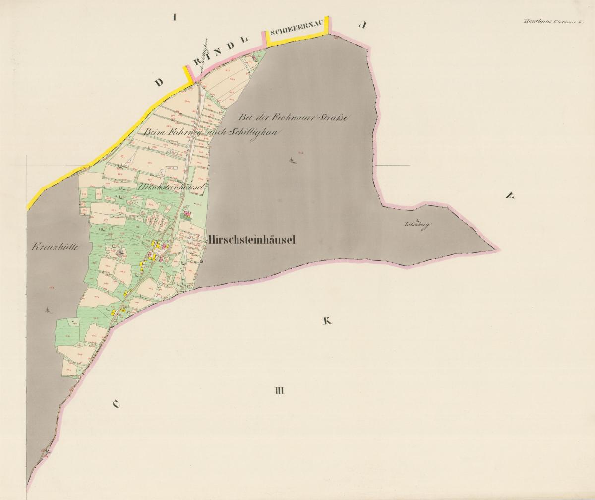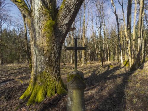Sobald Sie den rot markierten Wanderweg betreten, gehen Sie durch das ehemalige Dorf Hirschsteinhäusel. Das Wegkreuz stand früher im nördlichen Teil des Dorfes. Das Zentrum des ehemaligen Dorfes würden Sie in der Nähe des zweiten Wegkreuzes vorfinden, wenn Sie von der Kreuzung der Wanderwege etwa 50 Meter auf dem grün markierten Wanderweg weitergehen würden. Ringsherum gab es überall Felder, Wiesen und Weiden. In den Wäldern können Sie die Grenzen zwischen den Flurstücken noch an den Erhöhungen aus gesammelten Steinen erkennen.