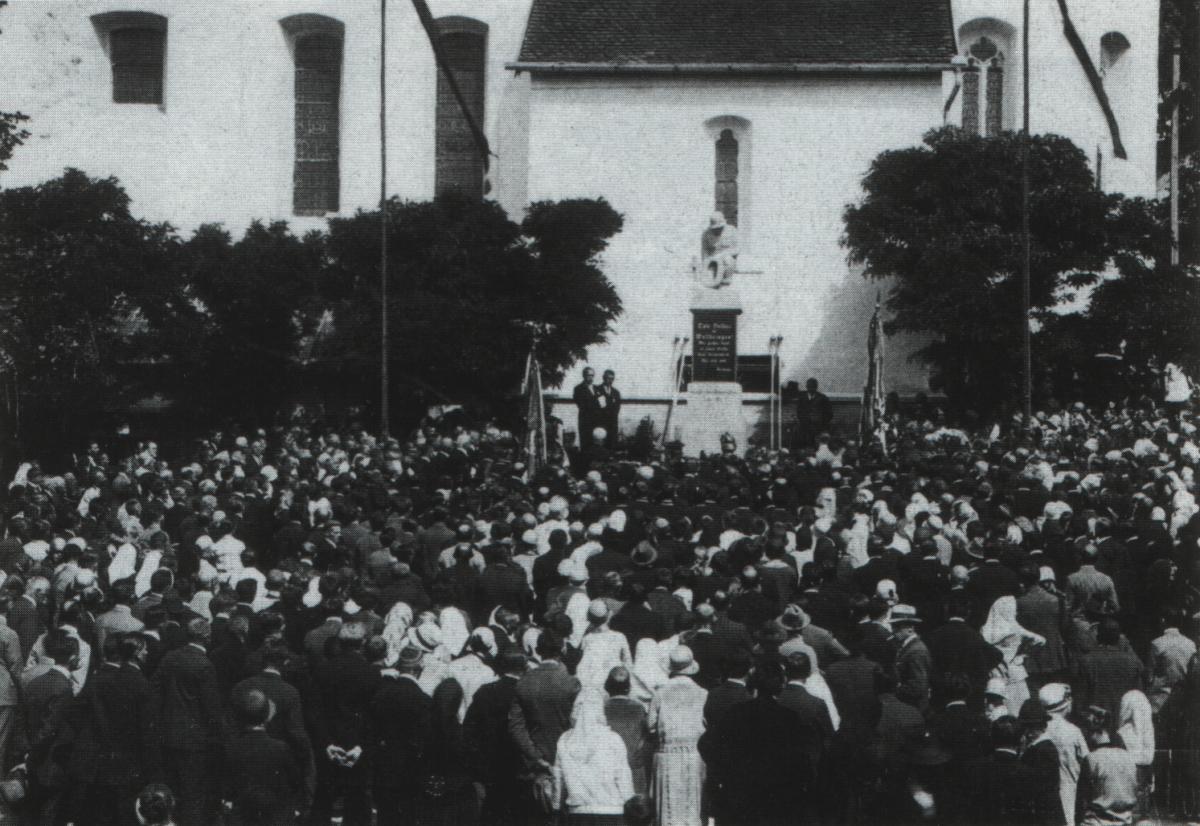 Das Denkmal wurde in den 1920er Jahren enthüllt und sollte an die Deutschen, Tschechen und Juden aus der Region erinnern, die auf den Schlachtfeldern des Ersten Weltkriegs ihr Leben gelassen hatten. Das Denkmal überlebte den Zweiten Weltkrieg, anders als die Mitglieder der örtlichen jüdischen Gemeinde. Auf den Krieg folgte die Zwangsumsiedlung der örtlichen Deutschen. Die Statue des Soldaten wurde von dem Denkmal entfernt, und ihre Existenz geriet mit der Zeit in Vergessenheit.