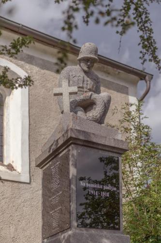 Na první pohled nenápadný pomník, jehož příběh by ale vydal na román. Připomíná místní muže, kteří padli na frontách „velké války“. Po roce 1945 však socha klečícího vojáka zmizela z podstavce a na dlouhá desetiletí byla považována za ztracenou. Až v roce 2015 byla objevena během archeologického průzkumu u poběžovické synagogy. Po restaurování se v roce 2020 vrátila zpět na své původní místo.