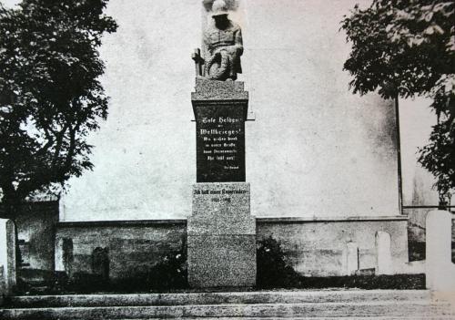 Pomník byl odhalen ve 20. letech 20. století a stal se důstojnou připomínkou zdejších Němců, Čechů i Židů, kteří položili životy na bojištích první světové války. Přečkal druhou světovou válku, na rozdíl od členů zdejší židovské komunity. Po válce pak následovalo nucené vysídlení místních Němců. Z pomníku byla odstraněna socha vojáka a její existence časem upadla v zapomnění.