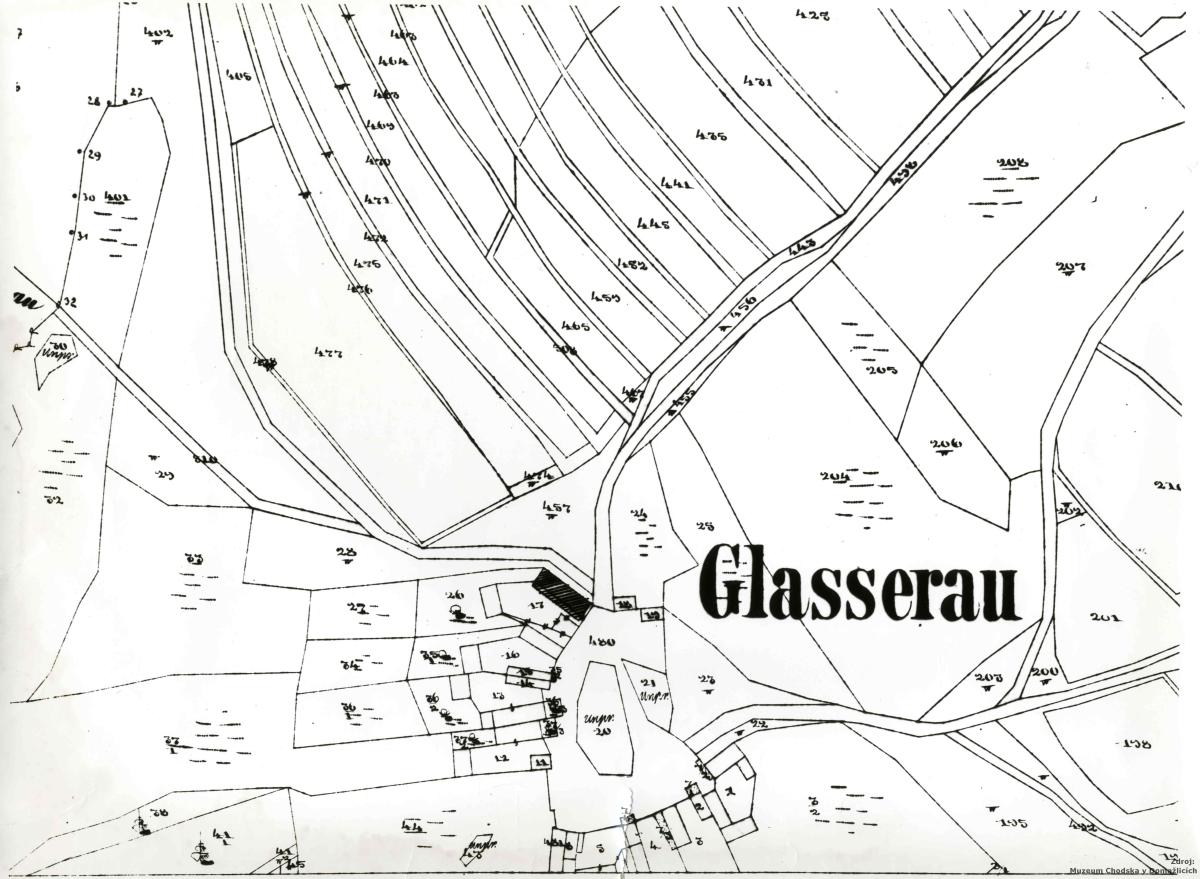 Glaserau wurde 1586 um eine Glashütte herum errichtet, die wahrscheinlich von den Augustinermönchen aus Stockau in dieser Gegend gegründet wurde. Von ihr sind keine Spuren mehr vorhanden. Wie der Name schon sagt, lebten die Einwohner von der Glasherstellung und dem Hinzuverdienst durch Landwirtschaft und Waldarbeit. Als die Glashütte aufgegeben wurde, blieben die Menschen zurück, aber das Umland konnte nur weniger als hundert von ihnen ernähren. Vor dem Krieg lebten in 16 Häusern 80 Menschen, davon 76 Deutschsprachige.